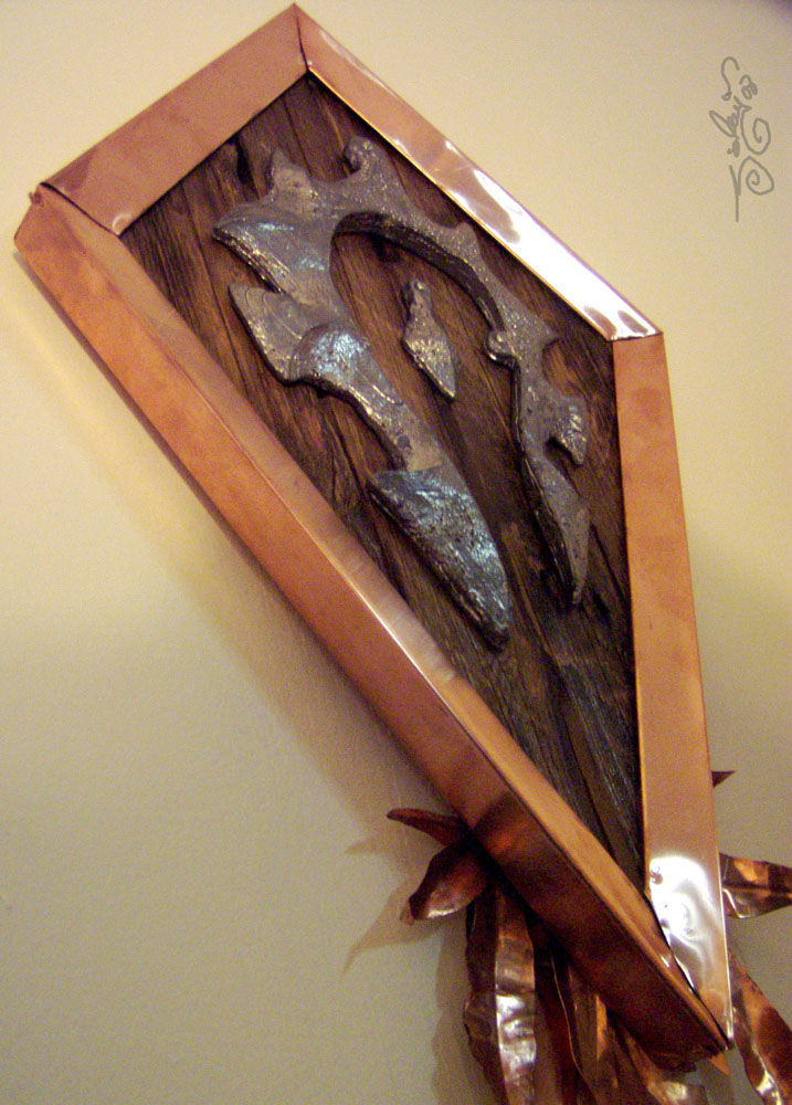 Para dar un par de detalles es el logotipo de la horda fabricado sobre una base de madera de pino y podrida (un palé que me encontré en la calle) con los bordes y las hojas en chapa de cobre de 08 y el emblema de la herradura rara hecho en barro y fundido en plomo con molde de escayola y luego barnizado para que no pierda del todo el brillo.