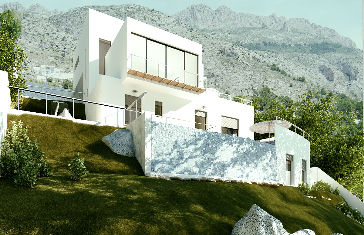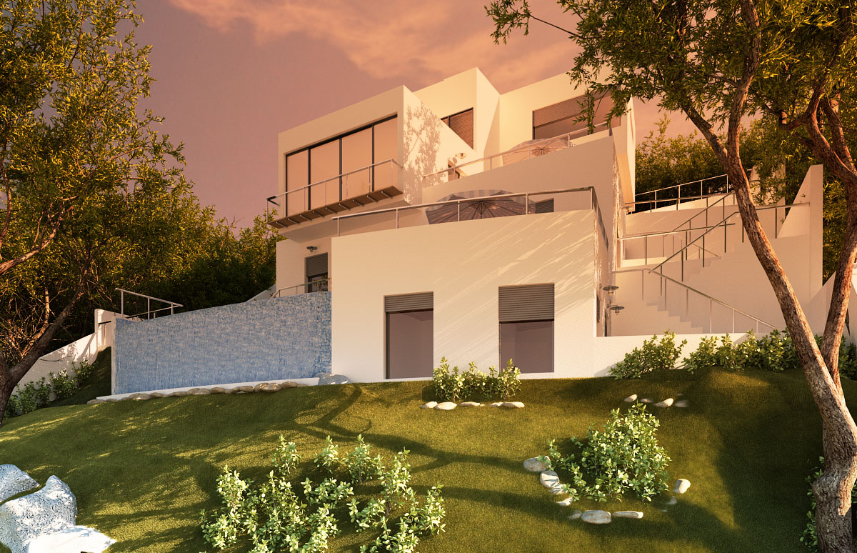 Buenas a todos, dejo unas vistas de un chalet, se han aprovechado unas cutre fotografías (para mí que estaban hechas con un móvil,) para crear el entorno al chalet y ponerlas como buenamente se ha podido a modo de integración, incluso uniendo no sé cuantas fotografías para crear una misera panorámica, al menos me he entretenido un poco.