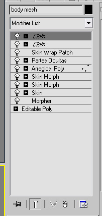 Entonces le he añadido el Morpher, adjunto una imagen de la lista de modificadores (el de arreglos poly es un poly edit). El problema está en que si lo pongo por encima del skin, funciona el Morpher, pero el personaje no se deforma con el skin, y si lo pongo debajo (donde esta) el skin funciona, pero el Morpher no.