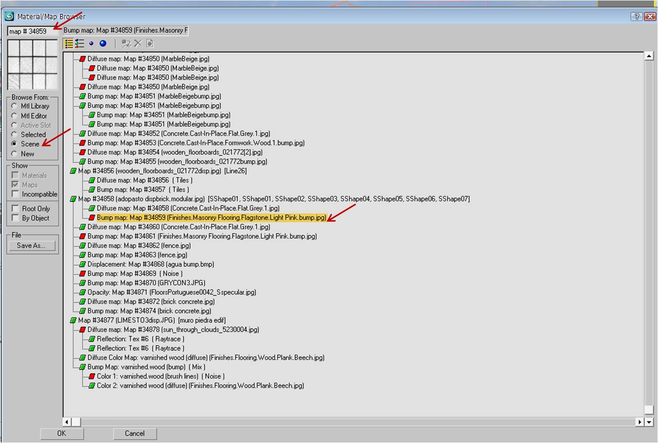 Purge allí, que yo conozca no, no lo he echo, porque del AutoCAD solo se unas pocas herramientas y desconozco esa, así que, alguien que sepa utilizar esa opción si la hay parecida en 3dsmax, pero yo buscaría los Bump que tienes en la escena de esa librería, Rappaniu, hay que nombrar en todos los proyectos todos los materiales de la escena, así en caso de erro, sabes que material es y que nombre tiene, sino es un lío.
