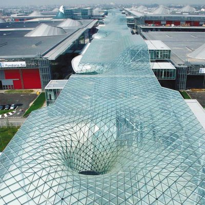 Os explico, quiero hacer un plano de estructura tridimensional triangulada (os dejo una fotografía de lo que es en papel para que os hagáis una idea). Una vez dibujado necesito deformarlo como pasa en las otras fotografías de un proyecto de Fuksas y otro ejemplo más, sin deformar las barras de la estructura (o lo menos posible al menos).