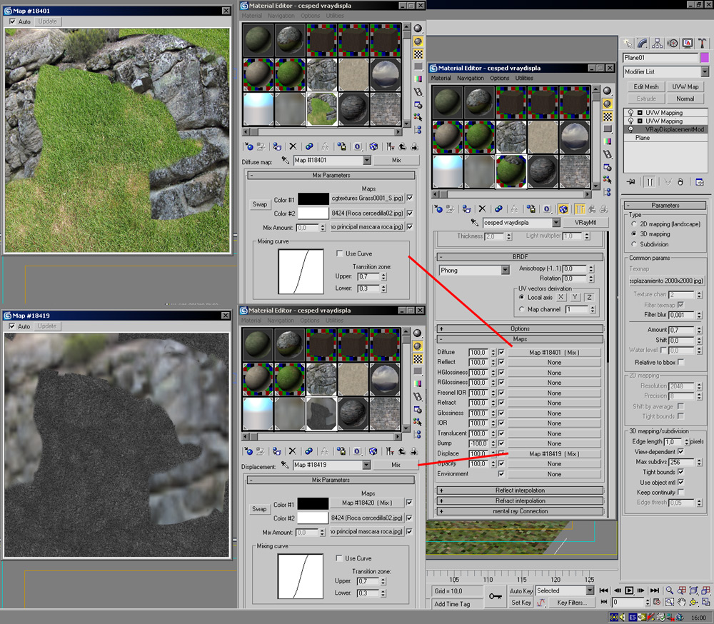 Con esto he conseguido ir pintando donde quiero mi camino, las hierbas de los lados del camino y las rocas o las zonas donde no hay hierba. Por ejemplo, un camino en la ladera de un acantilado, pasa luego por la hierba de la cuneta para terminar en las rocas del acantilado y esto lo voy haciendo siguiendo el terreno como en esos programas de pintar terrenos, pero en 3dsmax.