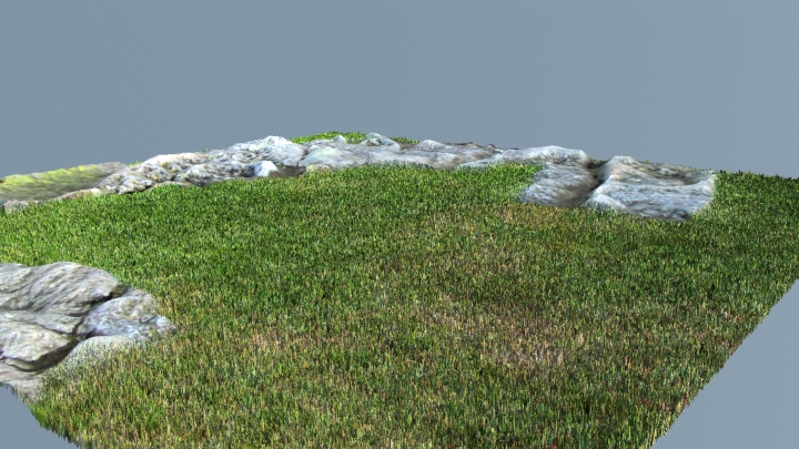 Ahora vuelvo a fusionar la malla respetando cada uno de los material id y los canales del material. De esta forma, obtengo un terreno grande con texturas muy poco pesadas y que respetan perfectamente las transiciones entre la tierra, las hierbas o las rocas sin perder la calidad al acercarse.