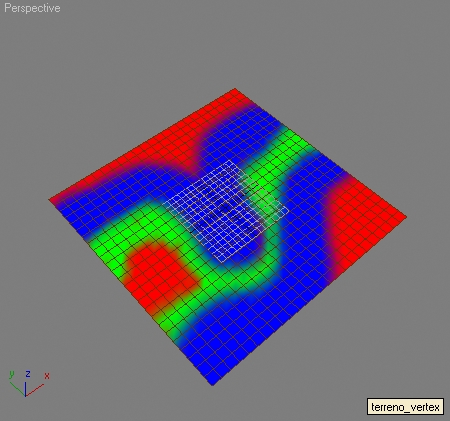 Haciendo una prueba, comencé con un plano al que le apliqué Vertex Paint y comencé a pintar usando los colores rojo, verde y azul. Cada uno será una textura específica.