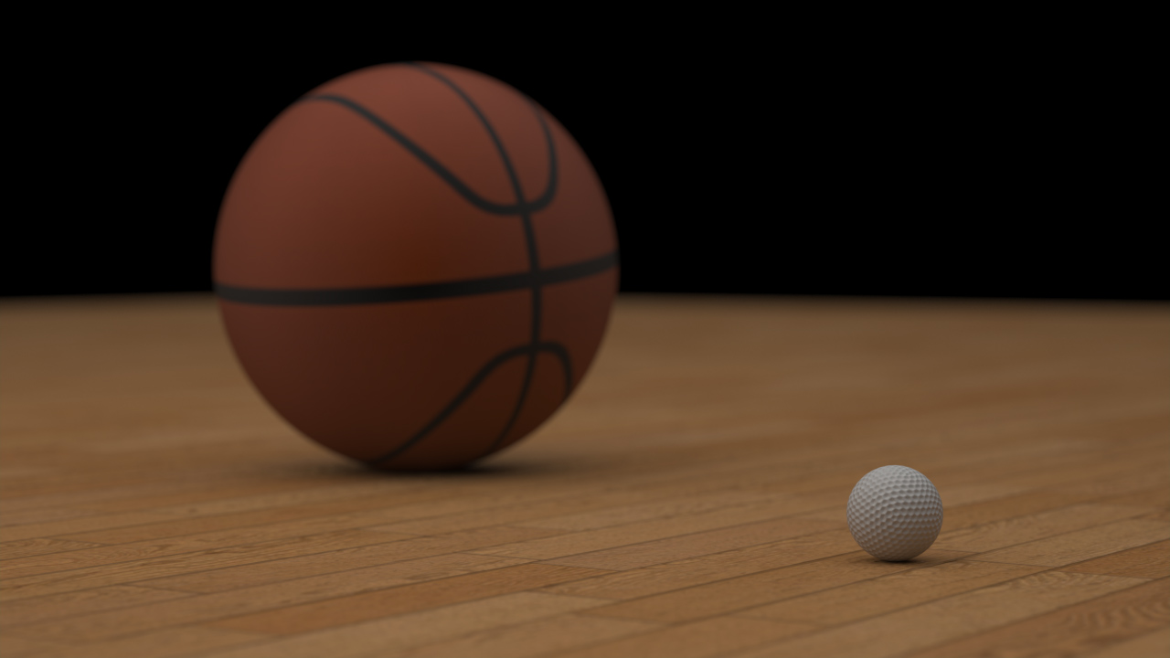Esta es una escena bien simple, un plano (suelo), una esfera (básquet) y una esfera con alguna perrería (golf), que me iba dando un benchmark por encima de 400, lo dejé una noche y el resultado es -al menos para mi- Bastante convincente (a 1280 por 720).