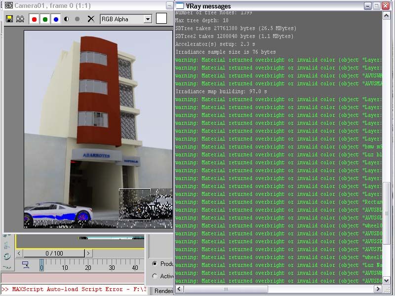 O es acaso un problema de configuración de la iluminación global, bueno la verdad es que primero pensé en el material ya que el aviso que sale es referente al color, además que la misma escena con la misma configuración, pero con pocos materiales no tenían ese problema, por eso es que pensé que estaba hacienda mal mis materiales.