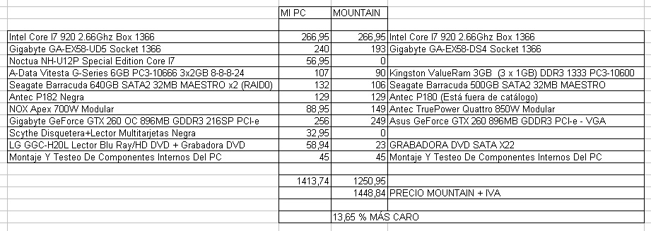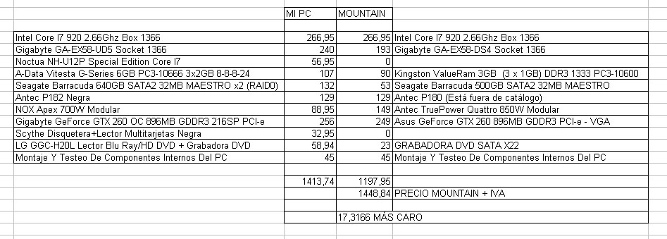Che, yo que esperaba que bajasen pues no sé, ya veré que hago. Respecto a las configuraciones, acabo de hacer un PC calcado al Mountain extreme i7 en PC componentes. Cuelgo la captura del Excel: