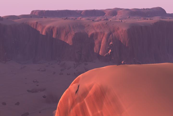 Un saludo a todos. Estoy realizando un tutorial de una revista sobre la creación de una escena desértica. En ella se utiliza una skylight y una Direct Light como iluminación, y Scanline como motor de render. En el terreno se aplica un material compuesto por muchos mapas (ver imagen) y un modificador UVW map alineado al eje y para las coordenadas de los lados del acantilado.