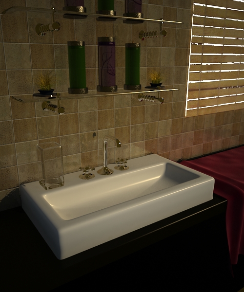 Antes que nada darte la bienvenida al foro. La imagen está bastante bien, puedes trabajar un poco más los detalles. Los botes de las estanterías están repetidos varias veces y no parece que pinten nada en un lavabo. El grifo parece de cristal, quizás te confundiste al aplicarle el material. También parece como muy pequeño, al igual que las ruedas para abrirlo, se ven descompensadas en comparación con el lavamanos.