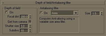 Area: esta función de filtrado es ideal para renders de prueba ya que es un filtrado muy sencillo de calcular y además nos probé de un parámetro de tamaño que ha menores valores dará imágenes rápidas de renderizar y más nítidas y a mayor tamaño más suaves y lentas. Ideal para pruebas. Una versión de este filtrado de más calidad es, por ejemplo, el cok variable si bien las otras funciones comentadas dan más calidad y tiempos de render ligeramente inferiores.