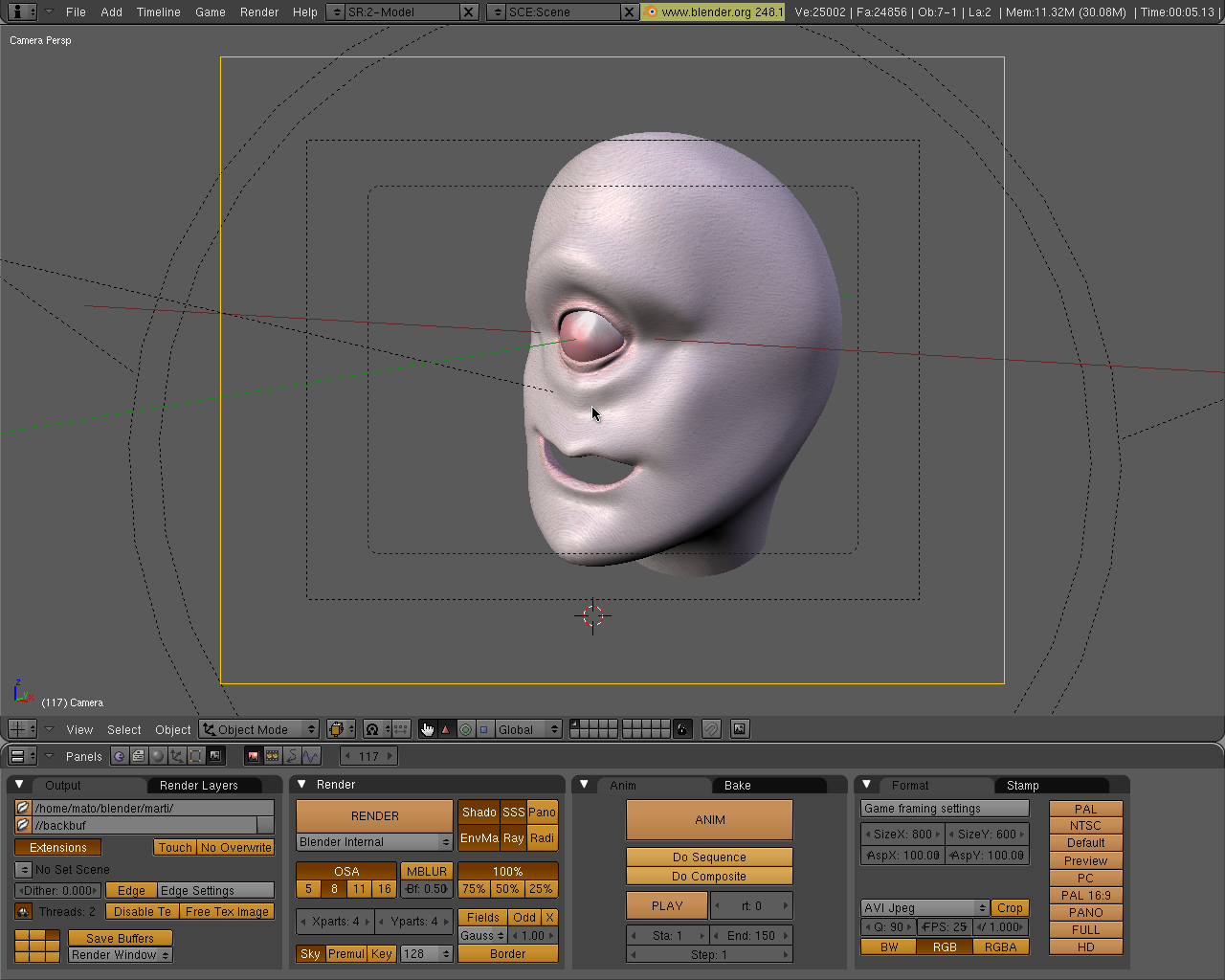 Pruebas y resultados con shape key para animar vértices de una Autodesk Maya, en este ejemplo se uso para animar párpados, boca, ceja y la pupila del ojo.