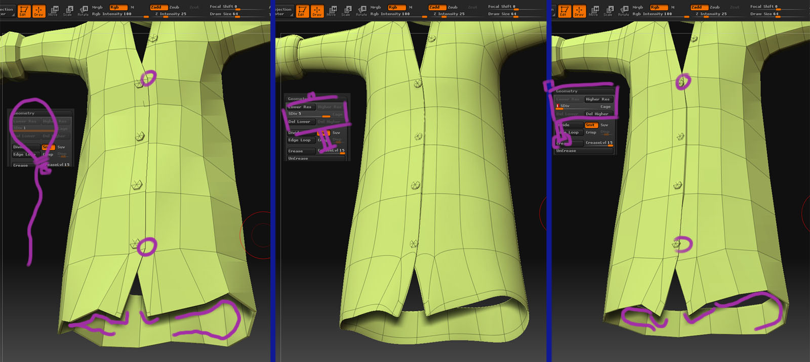 Si traigo una malla, en bajo poligonaje, (primera parte de la imagen), y empiezo a subdividir, ésta se suaviza y pierde parte de su forma original (parte central de la imagen), eso está claro. Bien. Pero si a esa malla subdividida, le bajo el rango a 1 como estaba la original (tercera parte de la imagen) ¿no se supone que debería preservar la forma del objeto antes de subdividirlo? Se ha perdido la forma angulosa de los bajos de la camisa, se han reducido los botones, incluso se ha encogido un poco la tensión de la camisa encima de los botones.