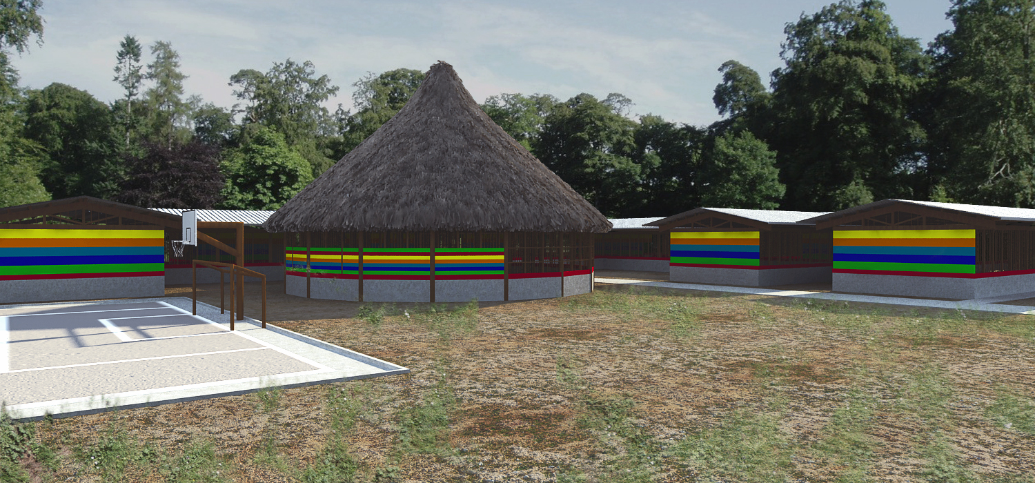 Este es un render exterior de un colegio indígena.
