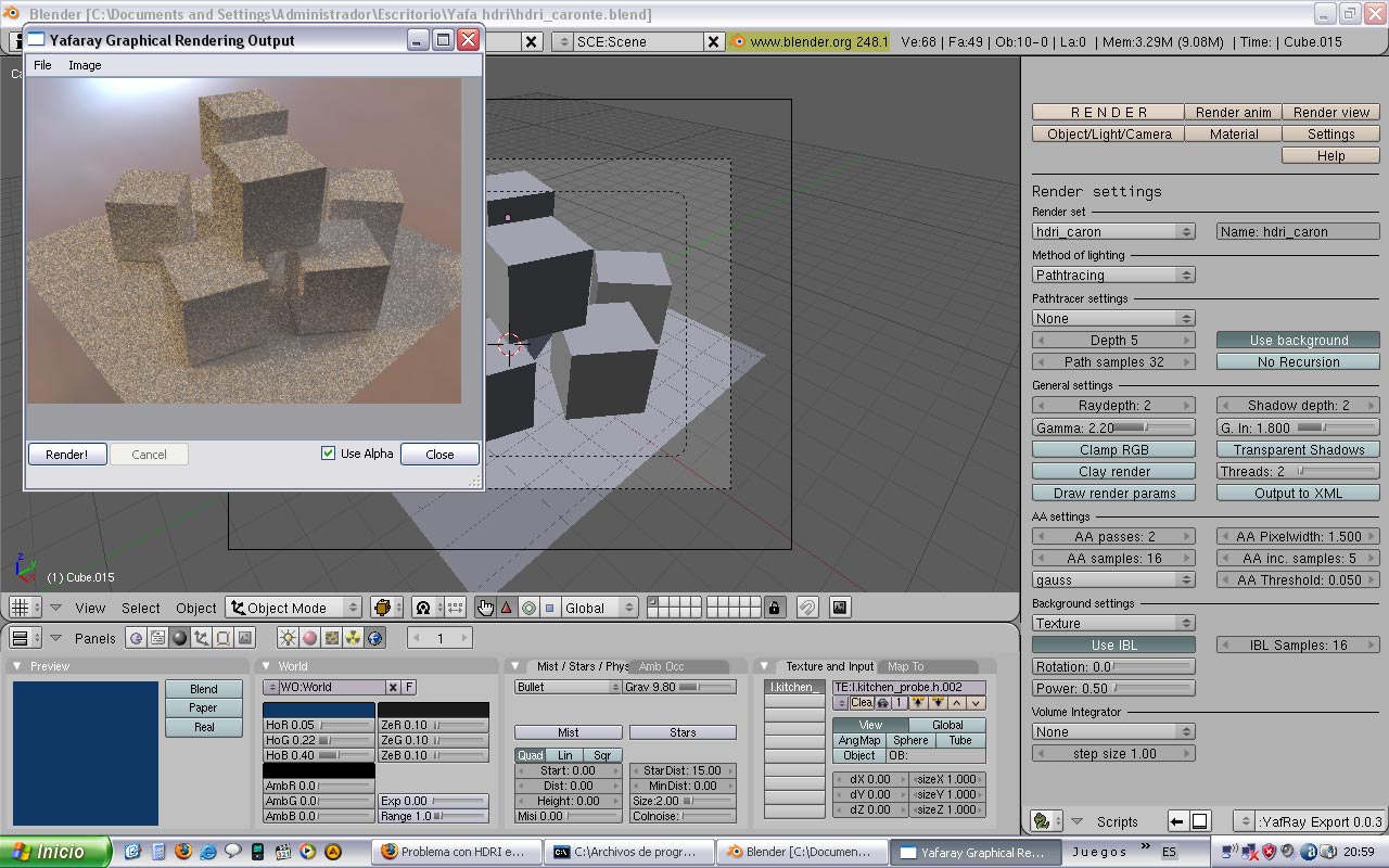 Abrimos la ventana de Yafray, usamos direct lightingo o Path tracing (Photon Mapping no soporta HDRI). En los casos de ejemplo he usado Direct Lighting.