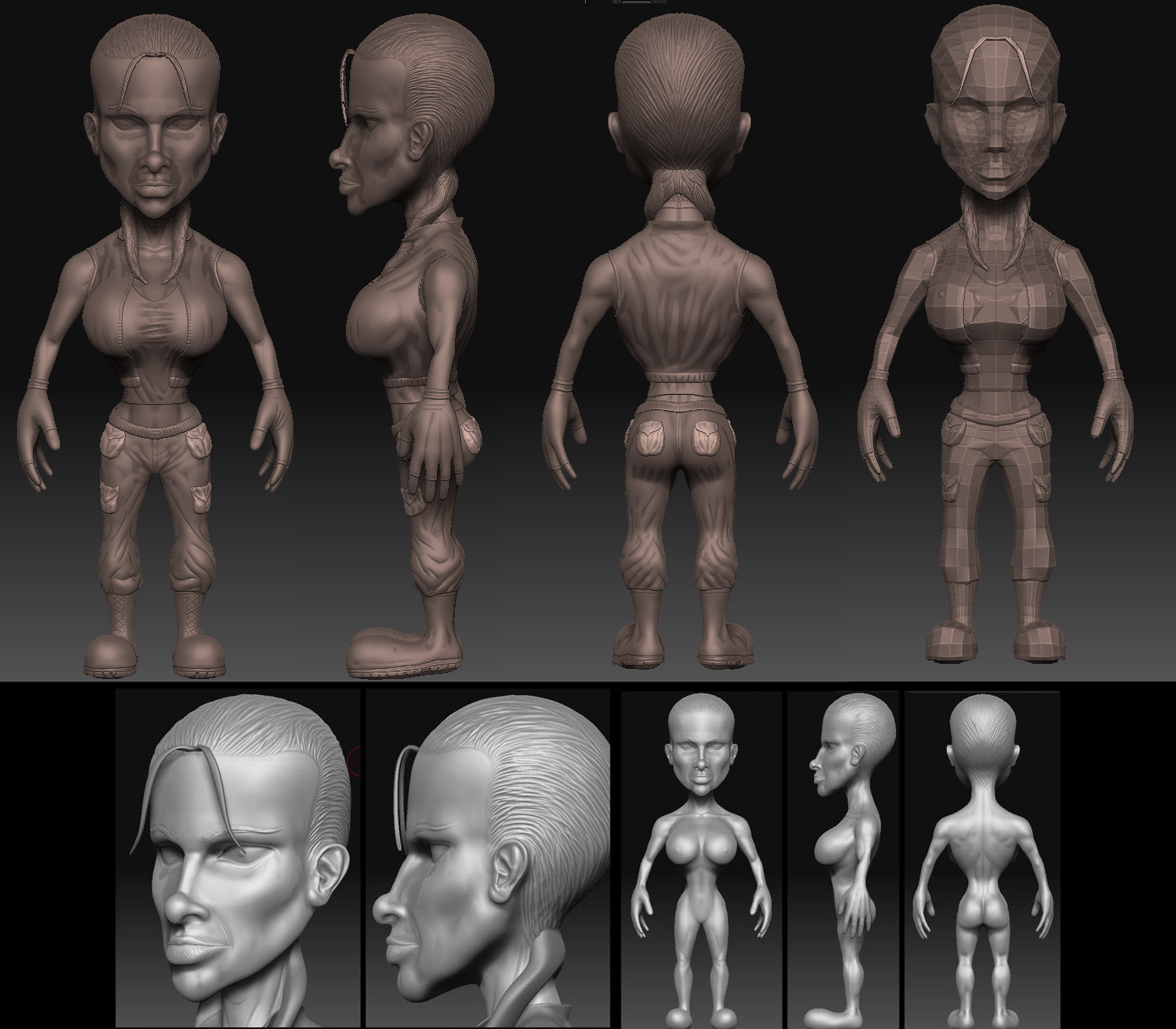 Hola ya tengo esculpida esta modelo, cada accesorio de ropa es un sub tool y se fue armando. http://www.Pixologic.com/ZBrush/features/05_subtols/.