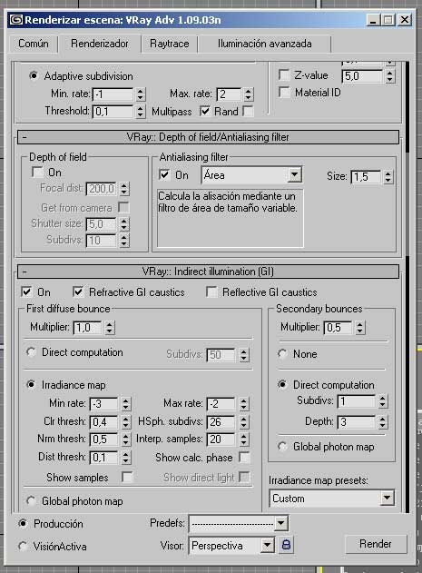 Me he instalado la versión del Vray 1.09, y me está dando unos problemas bastante grabes. No sé si se me escapa poner algún parámetro o es que mi ordenador tiene alguna incompatibilidad con el Vray el echo es que la imagen del render me sale como su estuviera posterizada. Os pongo un render de Vray, el mismo render con el motor del 3dsmax y los parámetros que puse en el Vray. Gracias.