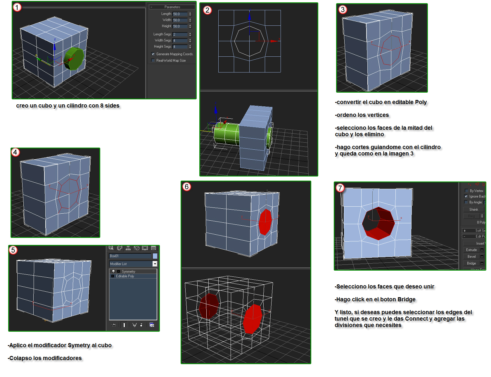 Hola, soy nuevo en el tema y quisiera saber si se puede moldear un polígono de acuerdo a otro, es decir, supongamos que tengo un box que lo paso a poly, y luego hago un tubo el cual lo pongo de modo que atraviese el box al medio de todas sus caras, hay forma de que en el box (ya echo poly) se perforen en sus interiores como así también en sus caras la forma del tubo?