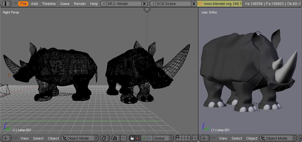 Hola como están, he estado buscando en el foro muchos tutoriales para iniciarme en esto del 3d, y encontré varios que puso Shazam, los he estado estudiando y pues este es mi primer modelado, es un rinoceronte, lo hice por medio de un cubo a base de puro extrude, el cuerpo y las piernas son separados y ya después los emparente, el material es solo un color.