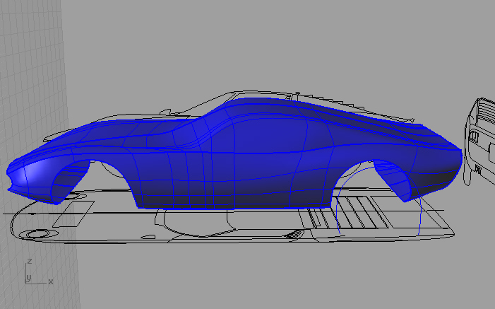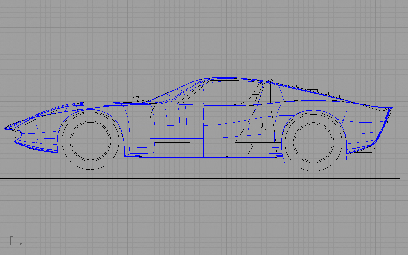 Estoy modelando mi primer coche en Rhinoceros, es un Lamborghini miura, siguiendo un tutorial de internet, este en concreto http://www.3dvault.net/wyatt/one.html.