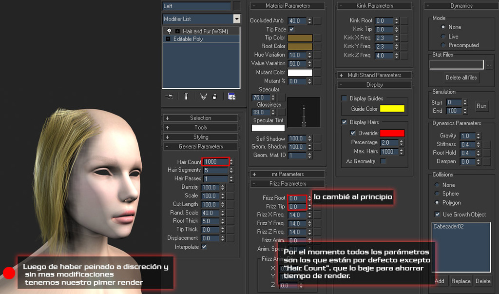 Está hecho en base a información recopilada de la web y experiencia propia sujeta a errores, aquí les dejo un manual que me sirvió mucho para saber más o menos que mover. manual Hair and Fur.