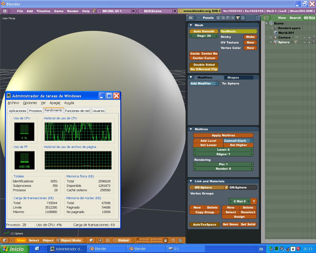 Ahora mi pregunta es: con la tarjeta de 512 Mb de Ram y con 2 Gb de Ram en la placa base ¿es normal que empiece a petar al llegar al millón de polígonos? Pongo una captura de una esfera con multires. ¿esta dando la máquina lo que debe dará.
