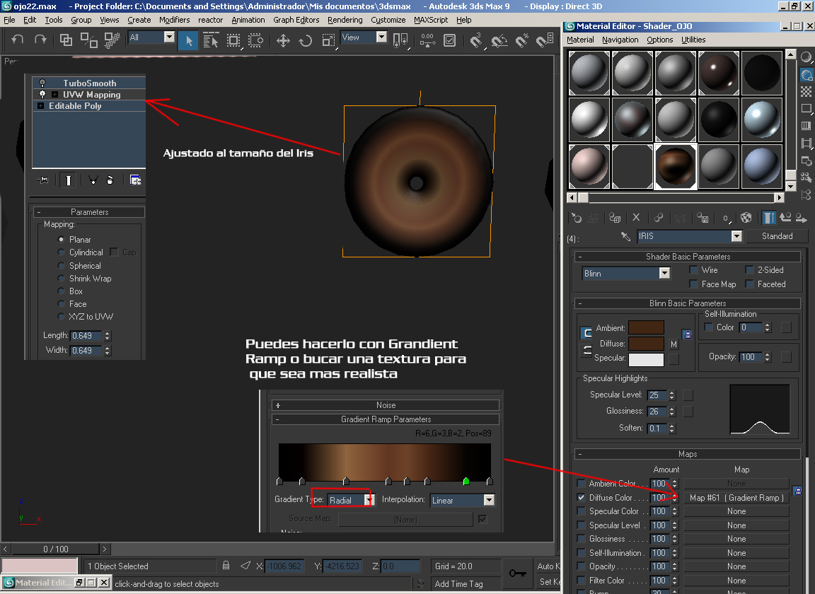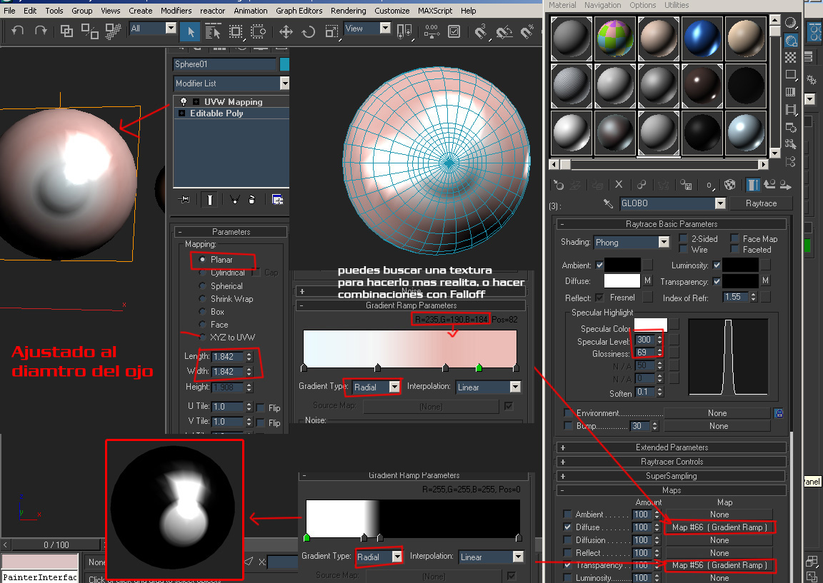 Hola manfred210308, por la red hay varios tutoriales de ojos que te pueden servir, pero te dejo uno que hice basándome en uno para Autodesk Maya, solo vi la primera parte de ahí le agregue cosas que me parecía que podría ir, y me dió un resultado aceptable.