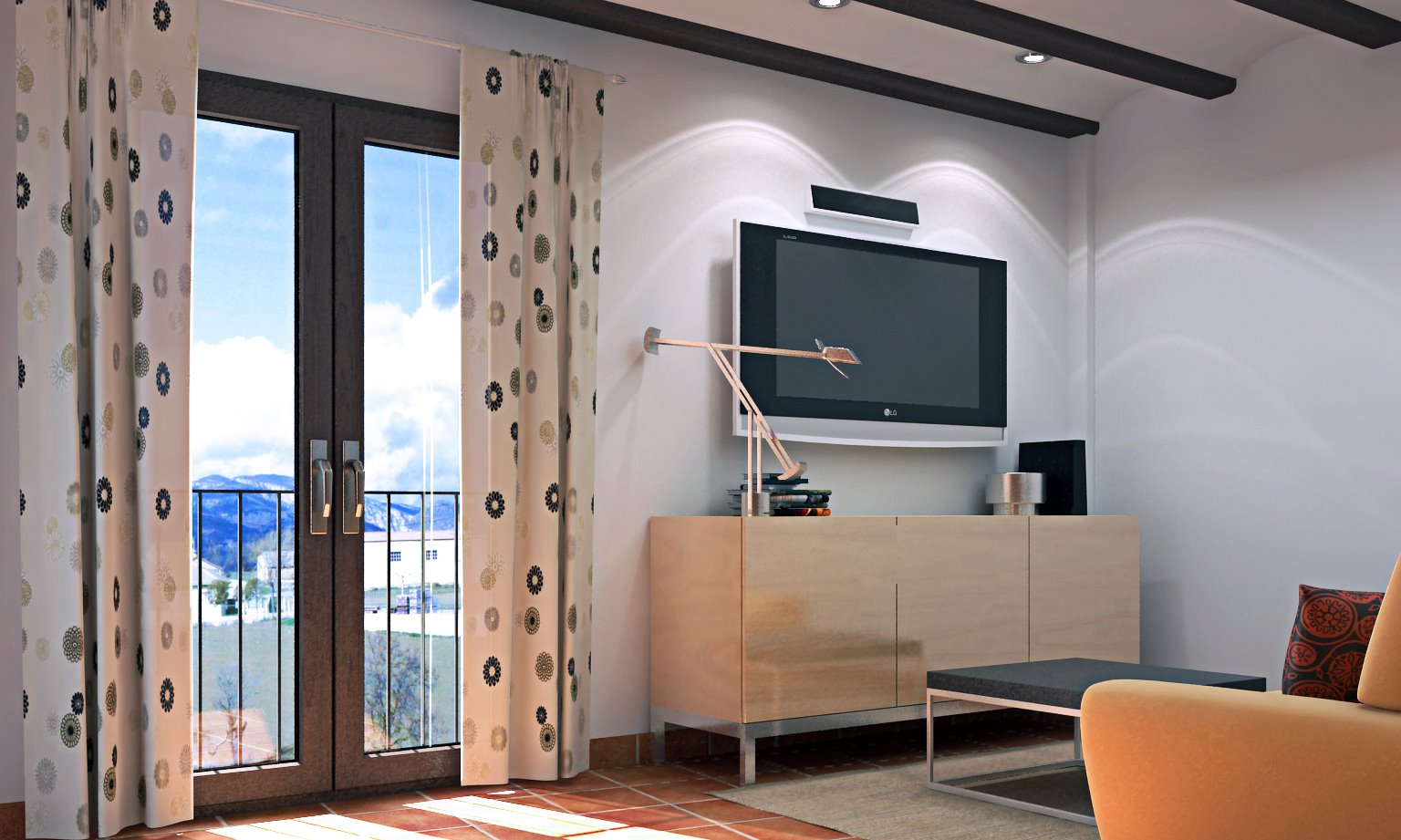Escena interior en la que lo que se quería conseguir es mostrar las vistas del pirineo de Huesca, aunque como el apartamento en cuestión solo tenía ese hueco de fachada no sé si ha conseguido. Está hecho con max 2009 y Vray. Saludos.