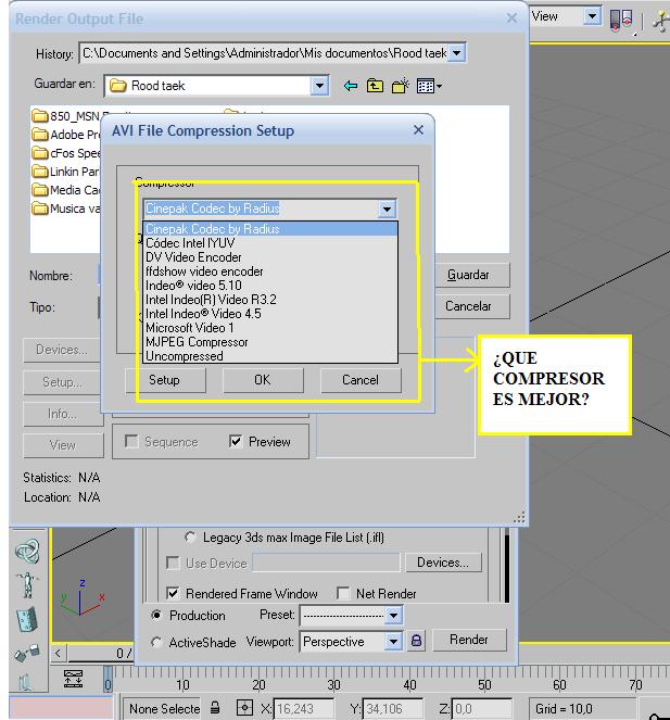 Hola a todos, bueno tengo una duda, hasta hace un tiempo cuando renderizaba una escena en 3ds Max y la guardaba en formato avi, no tenía ningún tipo de problemas a la hora de seleccionar un compresor determinado porque con el primero que aparecía en la lista me servia. Ahora me he fijado bien y tengo algunos errores en el video, por ejemplo, los colores y las texturas de los objetos quedan con mala calidad, también se generan algunas distorsiones en la cámara. Muy extraño todo eso. Aquí abajo les dejo una imagen con la lista de los compresores que trae max, si alguien sabe cuál es el mejor para renderizar en formato avi por favor díganme y se los agradeceré mucho. Saludos.