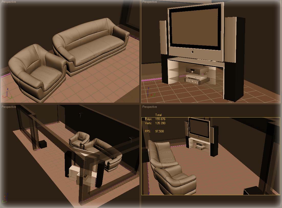 un pequeño avance. He eliminado alfombra por que ocupaba 8 millones de polígonos. Ahora tengo solo 450 000. Y muchas veces el 3ds Max me da error en renderizar la escena sin alfombra, será por que tengo poca memoria (2 Gb).