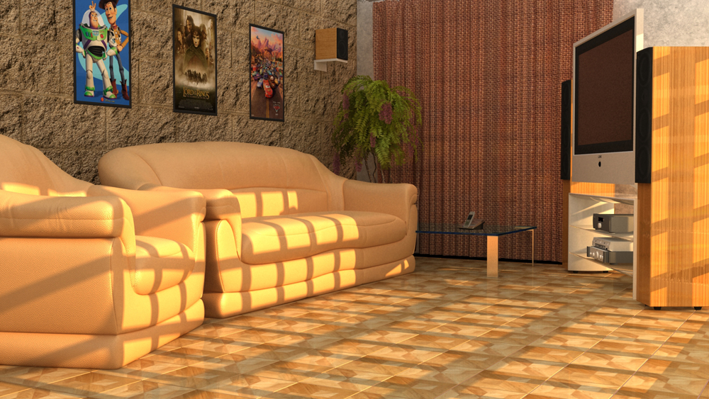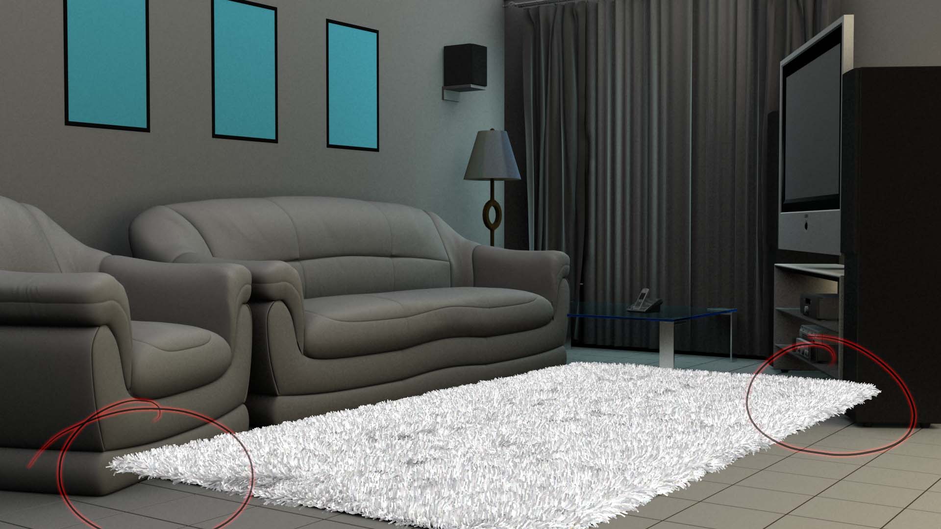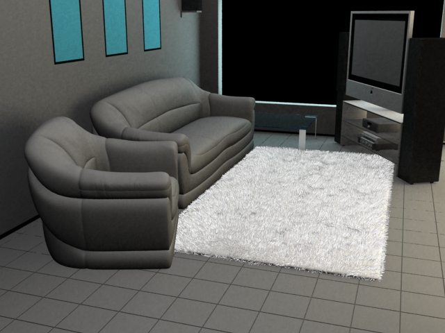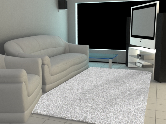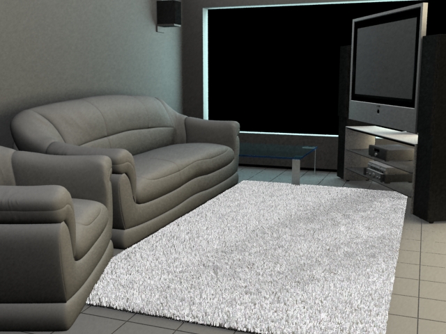 Yo me plantearía la disposición de los objetos, porque un home Cinema que tiene puesto la televisión y los bafles en un lateral de la sala, es poco creíble. Respecto a la alfombra, soy de Maya así que, no te puedo aconsejar sigue dándole, que está verde aún la cosa, peor tiene potencial para quedar una buena escena.