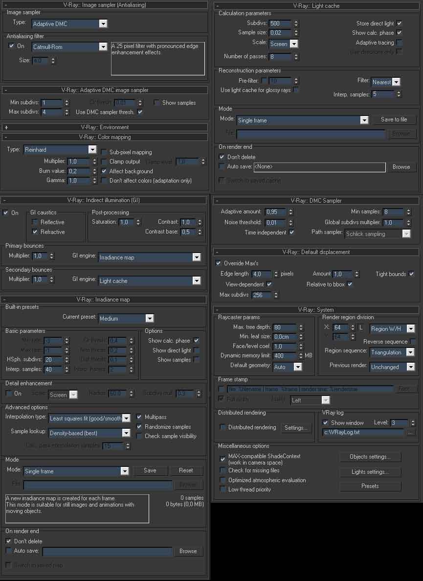 Y si probas activar el dont afect color, en el Color Mapping? Lo del override es muy útil, es un tipo de Vraymat, (está en la lista de (*.mat) nuevos), lo que hace es renderizar una textura x, ponle roja sangrante, pero tiene la opción de hacer que el rebote de GI de ese material sea otro material, por ejemplo, gris, entonces controlas completamente que ese (*.mat) no rebote rojo fuego. http://www.spot3d.com/Vray/help/150s...verridemtl.htm.