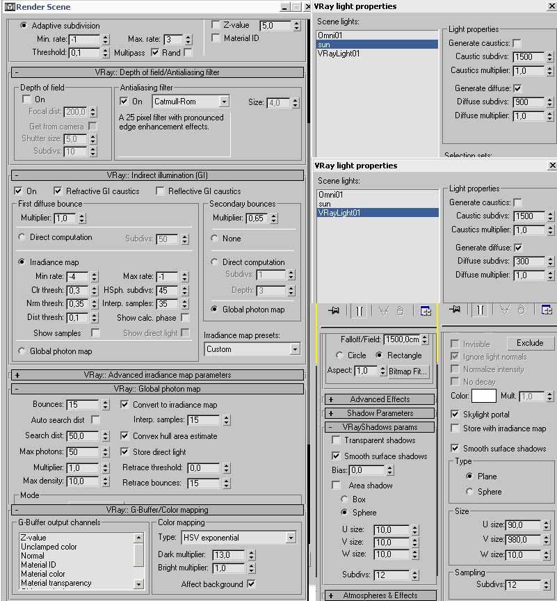 1 Vray light invisible, planar a lo largo de todas las ventanas, multiplier 1,5; RGB 255;249;232 y 20 subdivisión.