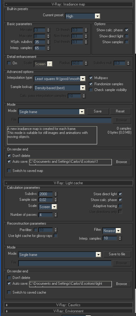 Perdón por el retraso tío, no he andado mucho por casa. Publico los parámetros, me está sacando loco tío, la historia escena esta, me refiero que lleva chicha, a que lleva todos los materiales a 50sdv todas las luces a 50sdv, lleva como unas 60 luces, además objetos que emiten luz, pero bueno el caso es que porque de un render a otro la ulminación me varía no lo entiendo.
