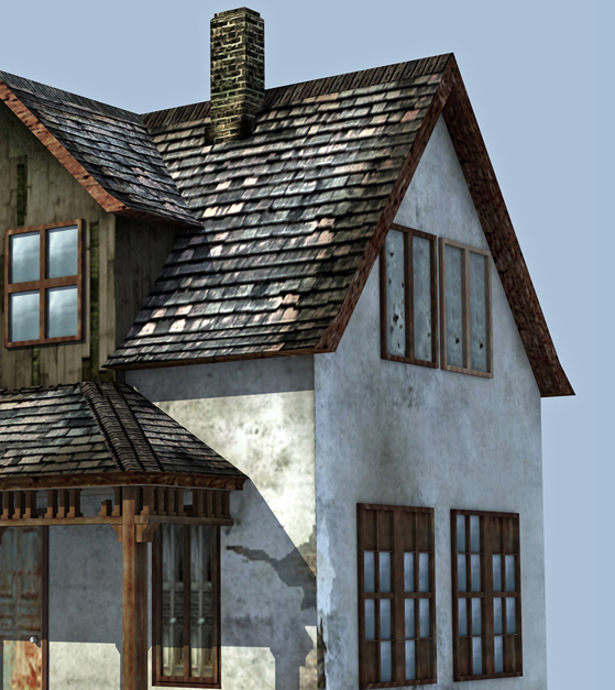 La textura del tejado esta conseguida. Y otra cosa que creo que no te ayuda mucho es esas aristas tan marcadas, quizá con chaflanes quedaría mejor.