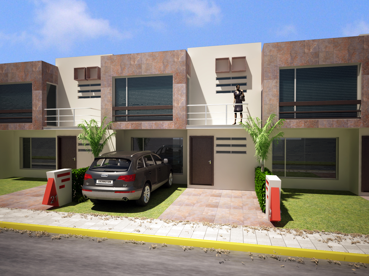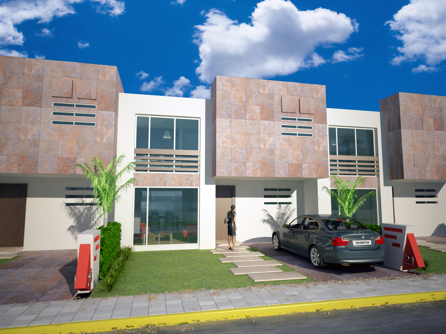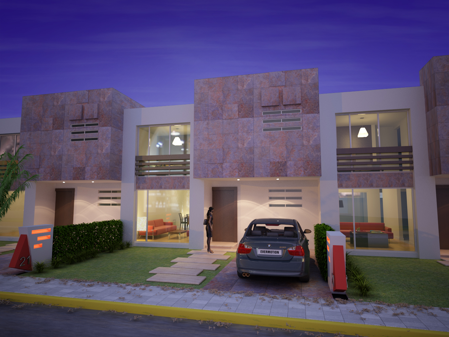 Este es mi segundo trabajo de exteriores de un conjunto habitaciónal. Como el modelo era realmente muy sencillo traté de que la iluminación impactara, así lo presento de día y de noche.
