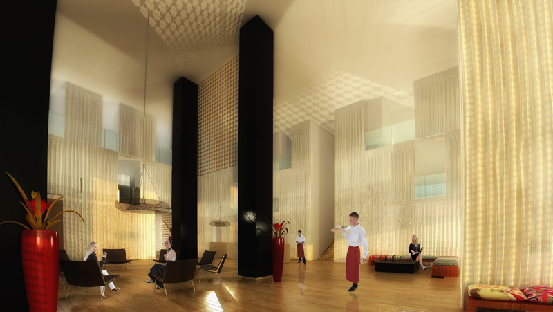 Me encanta el efecto de las sombras de las celosias/cortinas, muy guapa la escena. A lo mejor quedaría bien que la gente estuviera un poco desenfocada, para que así no descatacaran tanto y se mezclara más con el efecto aterciopelado de la luz de ambiente.