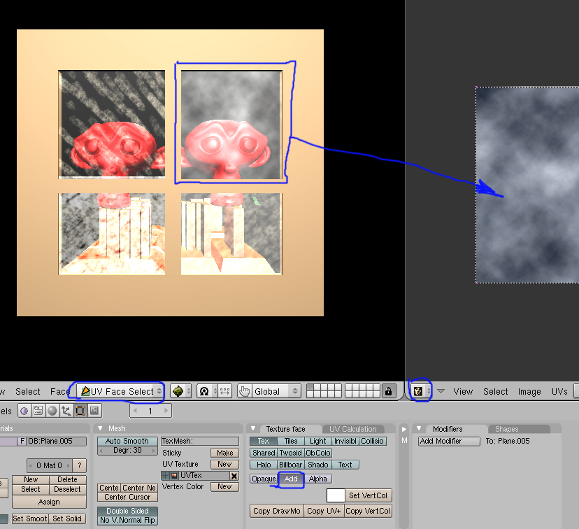 Solo hay que colocar un plano, entrar en UV face select y colocar la imagen que deseemos, presionamos f9 estando todavía en UV face select y marcamos el botón add en lugar de opaque. Presionamos p (game) y vemos el resultado.