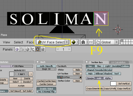 ahora vamos a hacer que el fondo que tiene de color negro desaparezca, para ello en UV face select, presionamos f9, elegimos uno de los cuadrados y en texture face presionamos el botón ad.