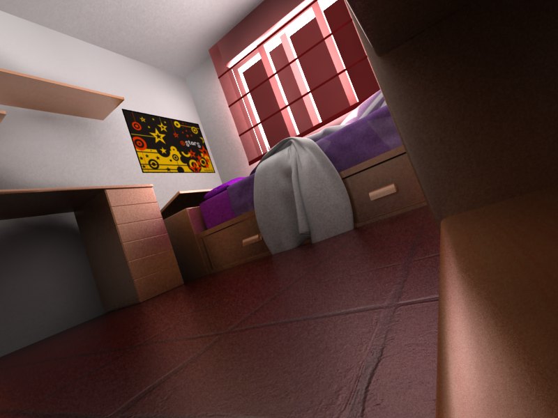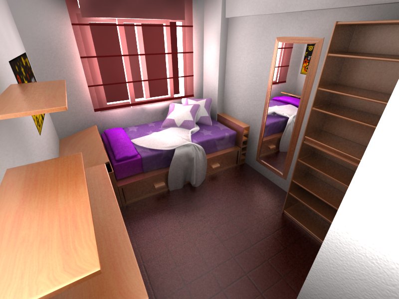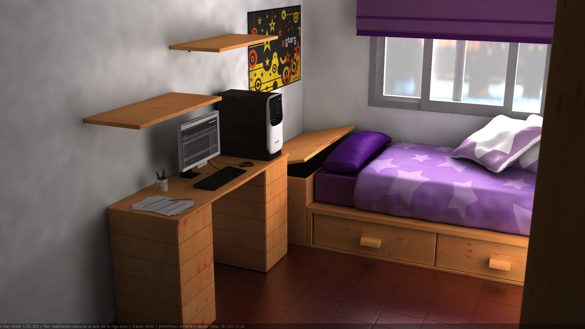 El modelado de los muebles ya lo tengo completo (solo me falta modelar las puertas de un armario empotrado). Ahora quiero centrarme en añadir detalles (libros en estanterías, el ordenador, algún peluche, ya sabéis, trastos que siempre hay por una habitación, y que le dan más realismo a la escena).