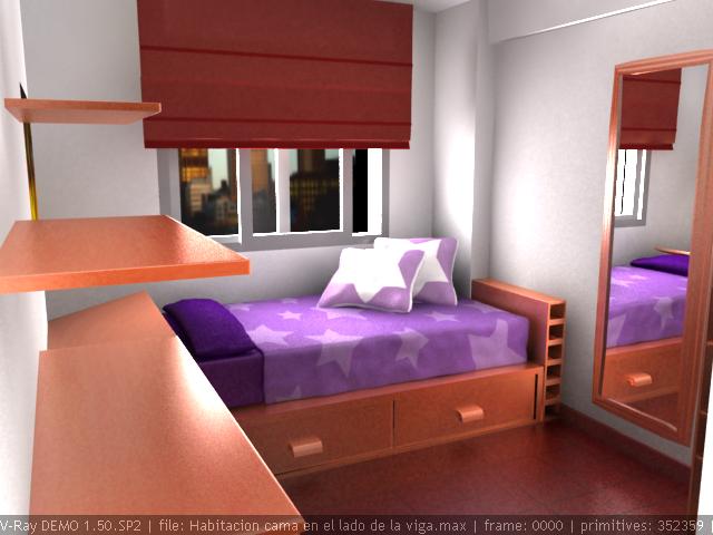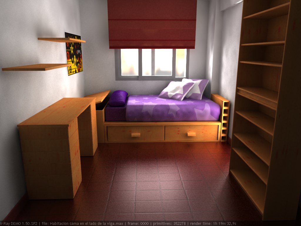 Hola a todos. Este es mi primer mensaje (exceptuando el primero que hice en el foro de presentaciones). Aquí os dejo un de los últimos renders que he hecho de esta escena. Llevo trabajando en ella no llega a una semana. Es la habitación de una amiga mía, ahora mismo quiere cambiar la distribución y la cama, y como yo (al igual que todos vosotros) estoy enganchado a esto del 3d, pues le dije que yo se la enseñaría tal cual quedará (quizá me aventuré demasiado al decir tal cual).