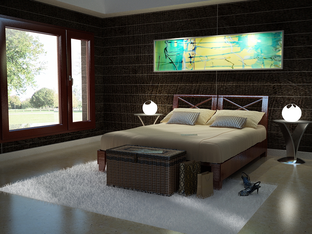 Hola, encuentro que la alfombra que está a los pies de la cama se ve muy rara, podrías darle más grosor al Fur para que se vea más natural y se ven demasiado planas las lámparas de los veladores, podrías hacer que se viera un poco más de detalle, se quemo mucho, el resto se ve muy bien. Saludos.