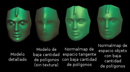 En la practica, es una especie de mapeado de choque avanzado. Necesitas dos modelos, uno simple de baja cantidad de polígonos y otro de alta cantidad de polígonos, versión detallada del anterior. Con las herramientas adecuadas, estarás preparado para hacer que el modelo de baja cantidad de polígonos luzca bastante similar al detallado, simplemente aplicando una textura de mapeado normal (normal mapping) al mismo. El mapa normal procede de la versión detallada del modelo.