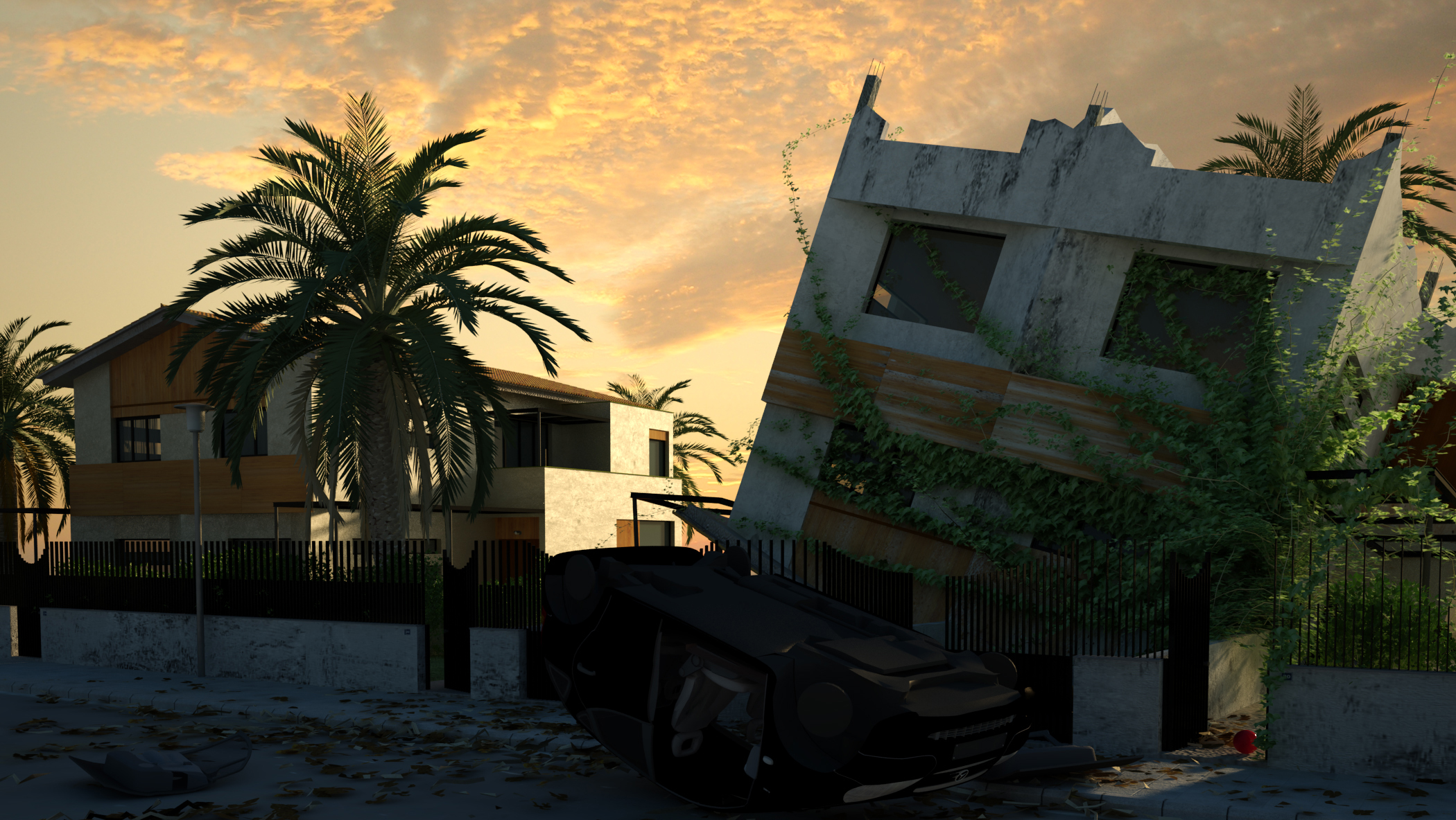 Desde luego, original es. Anda, enguarrínalo y rómpelo un poco que te lo vas a pasar teta y la imagen va a ganar mucho.Trabajando estoy ya en ello.Ya que lo vas a retocar agrégale relieve al tronco de la palmera y las ralladuras al auto por el vuelco. Lo demás está muy bien conseguido, una iluminación muy realista, la enredadera muy buena. Saludos.