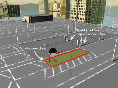 Of course, every shadow and light effect for the Shadeless objects had todo be Painted in the textures, or baked in some way, the casted shadows of Street-lamps and baskets have ben baked by a rendering from above, and the alpha channelled image has ben mapped on an untraceable plane todo match their location.