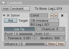 Now the IK Solver. Go into pose-mode [Control-tab]. Select one of the new Bones you just extruded then the last bone from the leg you extruded the new bone from and press [Control-i] -> todo selected bone. This Will add an IK Solver constraint todo the legs last bone targeting the new bone you just extruded. If you try todo move the target now, you Will notice the entire body is moving and the orange dotted line go todo the root bone. This is because the IK Solver goes up in the Hierarchy until it finds the top. To limit this, you can use the chainlen: number button. Its located in editbutton -> constraints panel in the IK Solver block.
