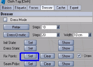 Una vez seleccionados los puntos vamos a las opciones de nuestra etiqueta Cloth dresser y le damos a fix points y así nos quedarán los puntos fijados.