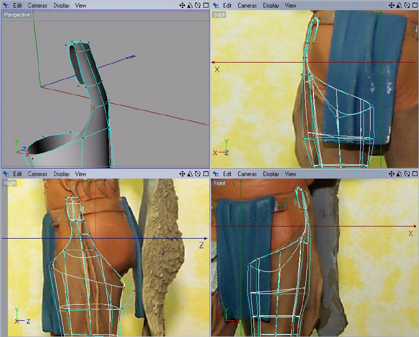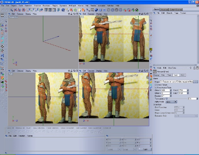 Bueno, ya tenemos nuestra imagen colocada en los diferentes visores. Una cosa que debéis tener en cuenta es que las imágenes, cuando se colocan en la vista izquierda, inferior, o trasera, se voltean. ¿por qué? Pues no sé por qué a estos chicos de Maxon se les ha ocurrido esto, tal vez para liarnos. Teniendo esto en cuenta y si vamos a usar alguna de estas vistas para modelar, lo que tendremos que hacer antes es sacar una copia de nuestra imagen de referencia volteada y será la que carguemos como fondo para estas vistas. Hombre, esto está bien en caso de que sólo tengamos una imagen de referencia de una cara, pero sí, como en este caso, nos hemos encargado de crear referencias tanto de una cara como de otra, o de frente o de espaldas, pues es una faena. En fin, cosas de alemanes, supongo.
