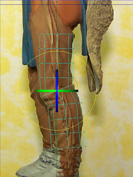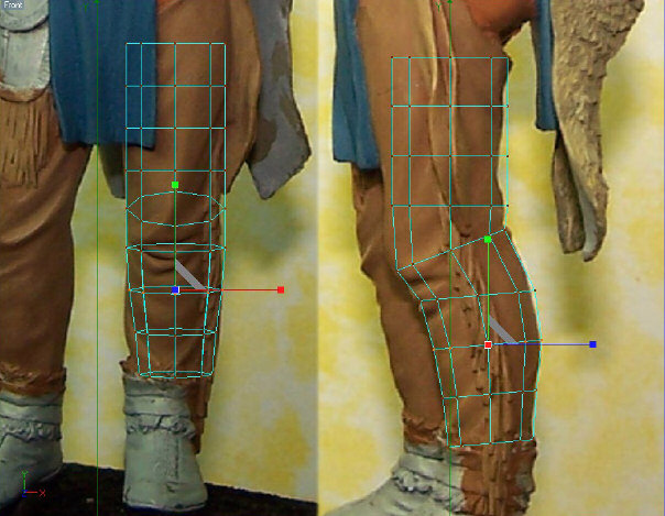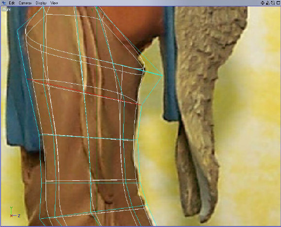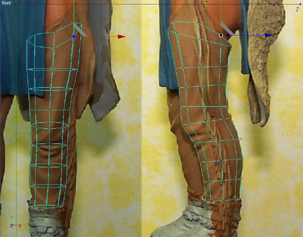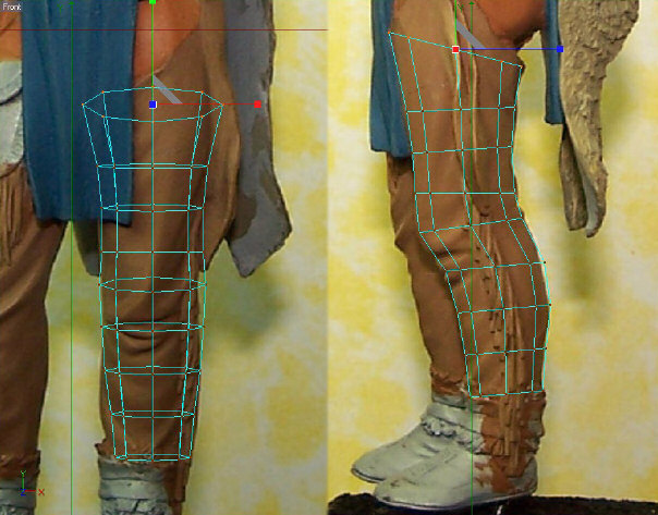 Y después de unos pocos minutos de modelado ya tenemos lista la pernera de esta especie de polaina (imagen 20). Ya podemos pasar a la otra pierna. Solo tenemos que descubrir todos los polígonos que teníamos ocultos y ocultar los del modelo que acabamos de hacer, y realizar el mismo proceso anterior. En este caso nos será más sencillo, ya que disponemos de gran parte del trabajo hecho, lo único que deberemos hacer es desplazar estos polígonos al lugar correspondiente en la vista para encuadrarlo con la imagen de referencia, en este caso la pierna derecha. Esta tiene una forma distinta así que, tendremos que hacer selección de puntos y desplazarnos hasta encuadrarlos en la referencia.
