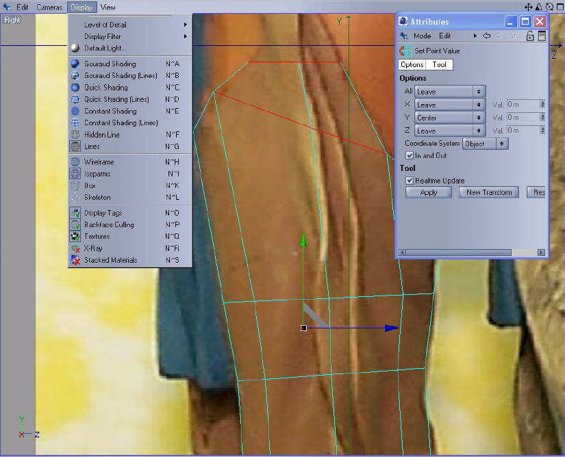 Bien, vamos, allá, empecemos a modelar. Vamos a modelar la pierna izquierda, y nos ayudaremos de la vista derecha y la frontal, así que, hemos de procurar tener centrada nuestra imagen de fondo en cada vista, dependiendo de la parte de la imagen que necesitemos, es decir, en la vista de frente centraremos la imagen frontal, y en la vista derecha centraremos la referencia lateral, para ello usaremos únicamente el deslizador del eje X de la pestaña back. De todas formas, la mejor manera de hacer esto es empezando a modelar.