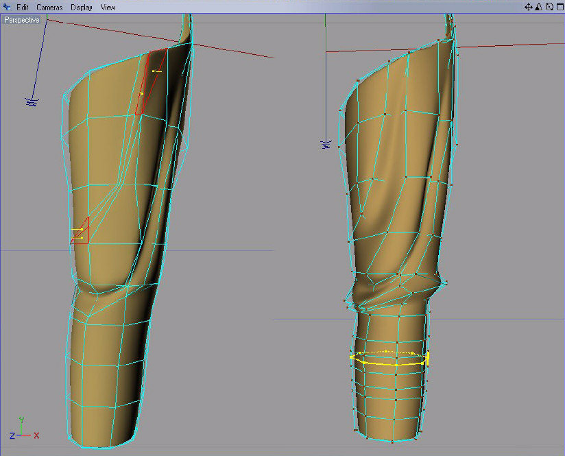 Las calzas en su parte superior tienen como unas tiras que se enrollan en una especie de cinturón, bien, lo único que haremos será ir extruyendo esas aristas y desplazándolas según se ve en las imágenes hasta tener la forma deseada.